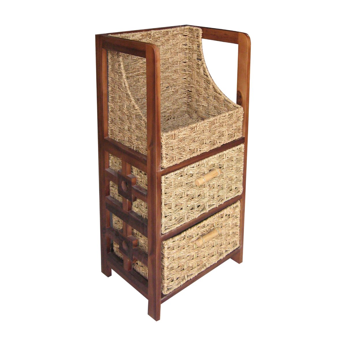 This Nature Craft storage unit features a crisp white wooden frame with two tiers. Each tier houses a hand-woven natural fiber basket, offering convenient and accessible storage. The open weave of the baskets adds a touch of natural texture, perfect for organized and stylish living.
