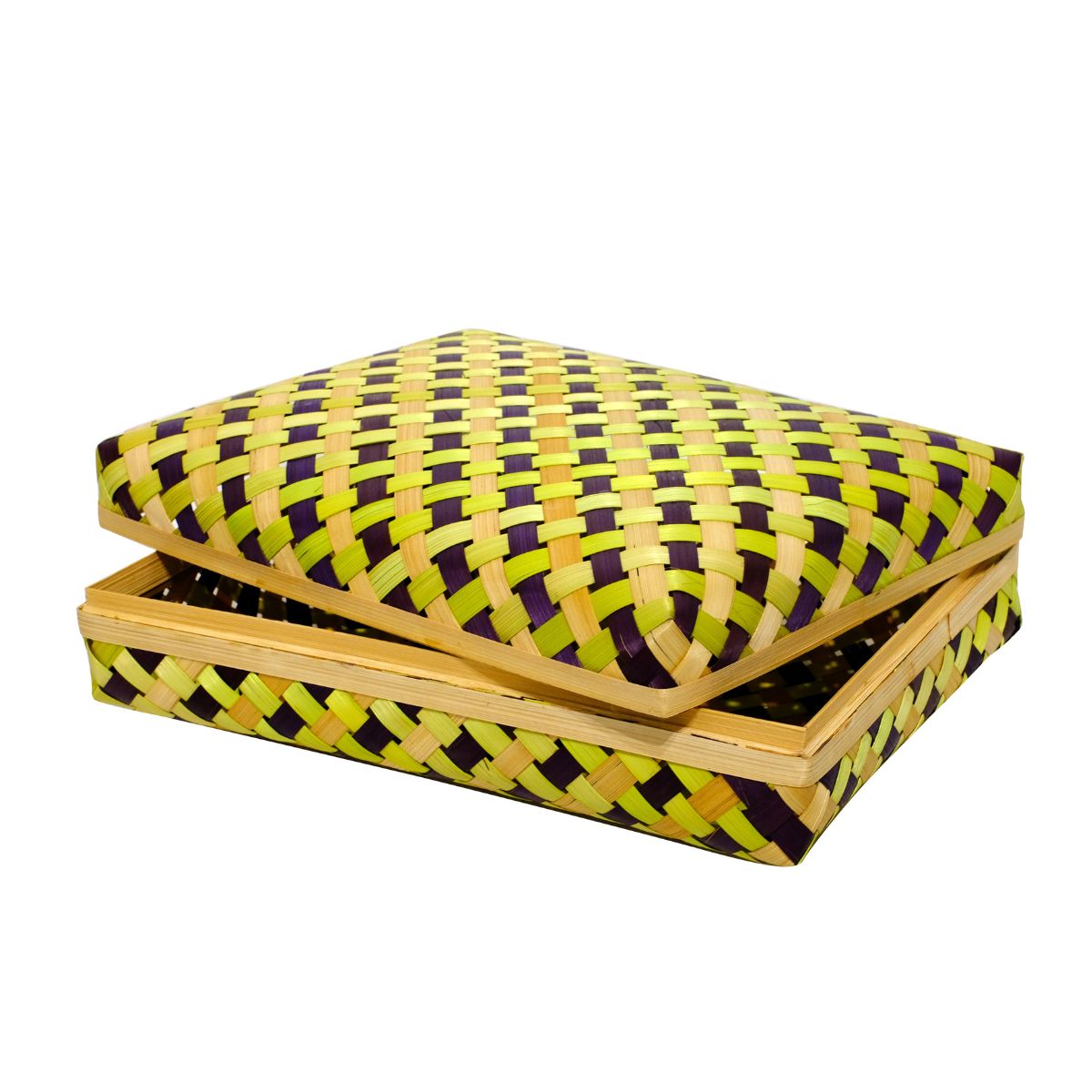 Store your treasures in style with the Nature Craft Woven Bamboo Box with Lid. This square box features a vibrant green and purple woven pattern, handcrafted from sustainable bamboo, offering a unique and decorative storage solution.