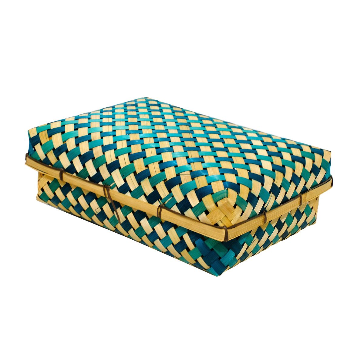 Organize your belongings with the vibrant charm of the Nature Craft Woven Bamboo Box with Lid. This rectangular box showcases a striking blue and green woven design, meticulously crafted from sustainable bamboo, providing a stylish storage option.