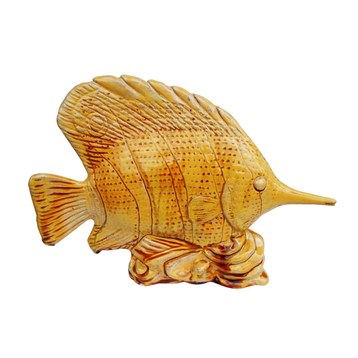This unique Nature Craft figurine beautifully captures the essence of a longnose butterflyfish. Crafted from ceramic with a warm, textured finish, it showcases intricate details from its elongated snout to its delicate fins. This charming piece brings a touch of aquatic beauty and natural artistry to any shelf, mantelpiece, or display.