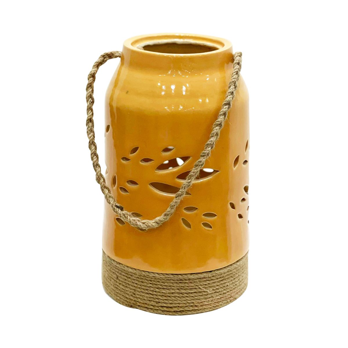 Brighten your decor with the Nature Craft Ceramic Cutout Lantern. This vibrant yellow, glazed ceramic lantern boasts intricate cutout designs that project captivating light patterns. A base wrapped in natural rope and a sturdy rope handle offer a rustic touch and easy portability, making it an ideal statement piece for any indoor or outdoor setting.
