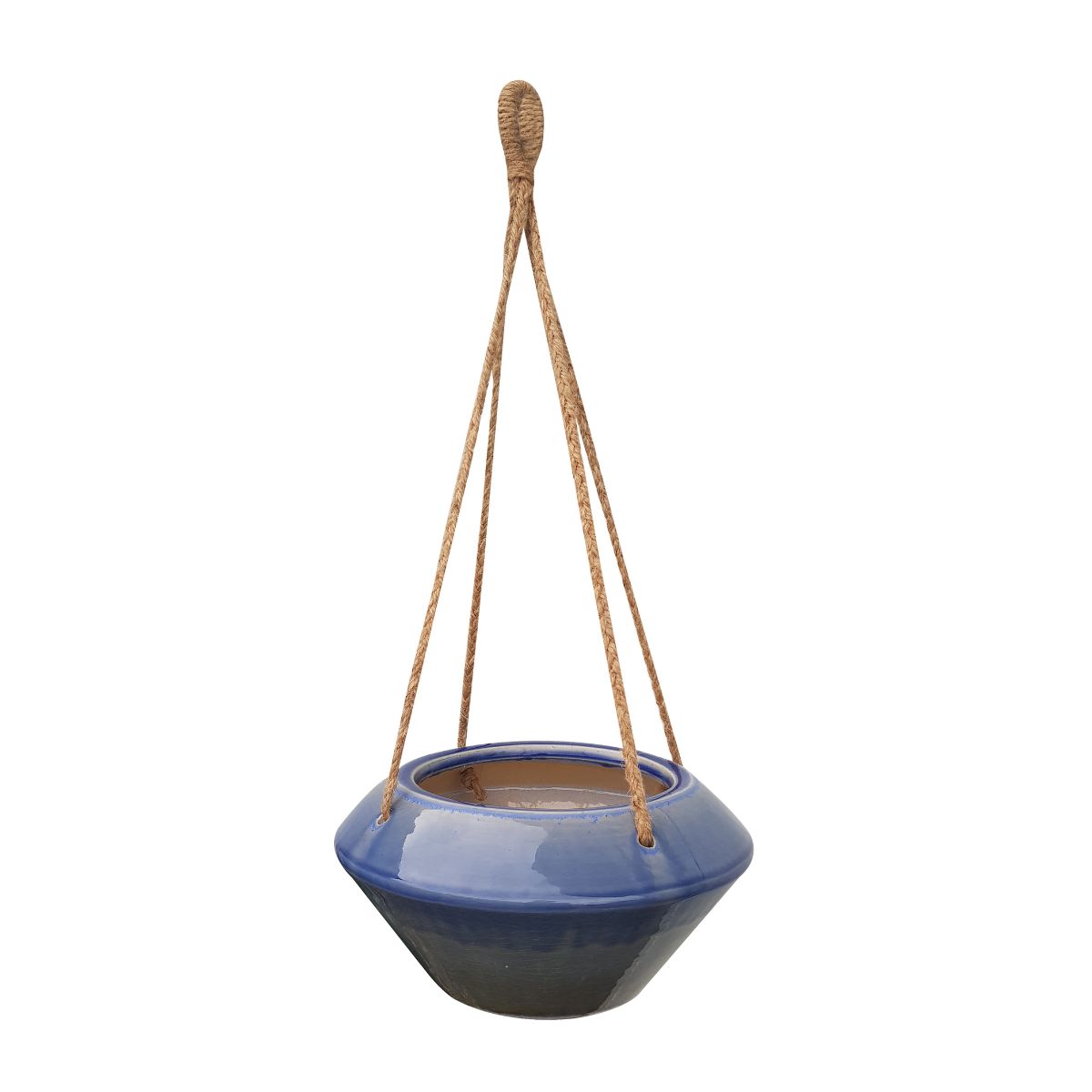Elevate your greenery with the Nature Craft Horizon Hanging Planter. This unique ceramic piece features a glossy two-tone blue glaze, with a lighter upper half transitioning to a darker base. Its wide, open bowl is perfect for showcasing succulents or small plants. Suspended by sturdy braided ropes, it creates a serene floating display, adding a tranquil yet stylish element to any indoor or outdoor setting.