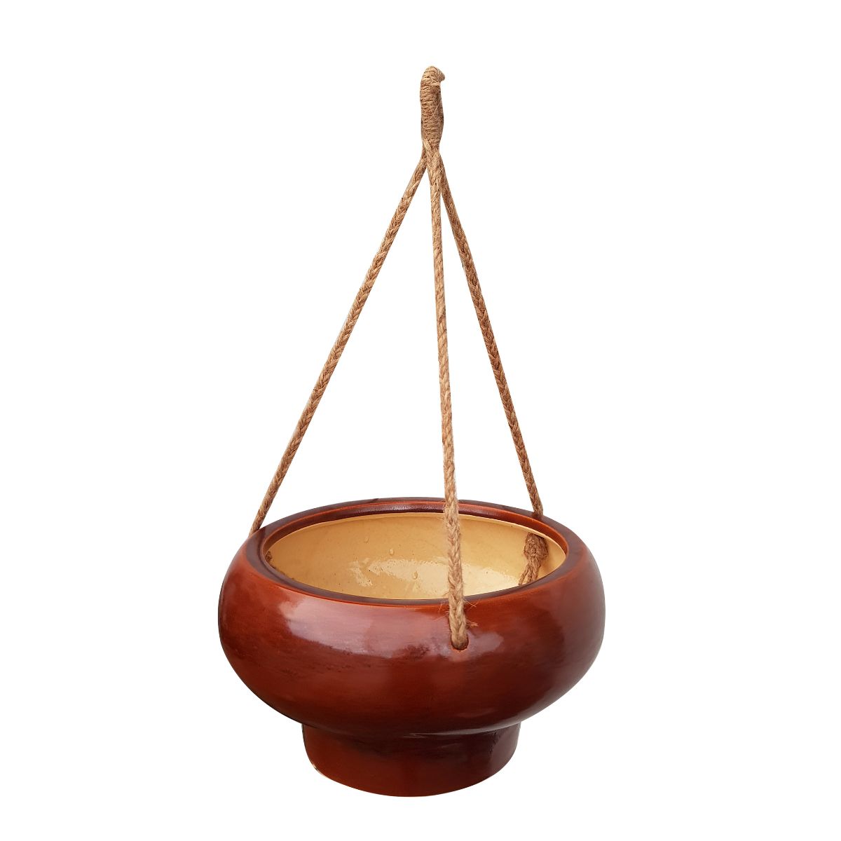 Adorn your space with the Nature Craft Crimson Sphere Hanging Planter. This elegant ceramic pot features a rich, glossy dark red-brown glaze and a smooth, rounded form. Suspended by three sturdy natural ropes, it creates a captivating floating display for your favorite succulents or small trailing plants. Its robust design and deep color add a touch of warm, earthy sophistication to any indoor or outdoor setting.
