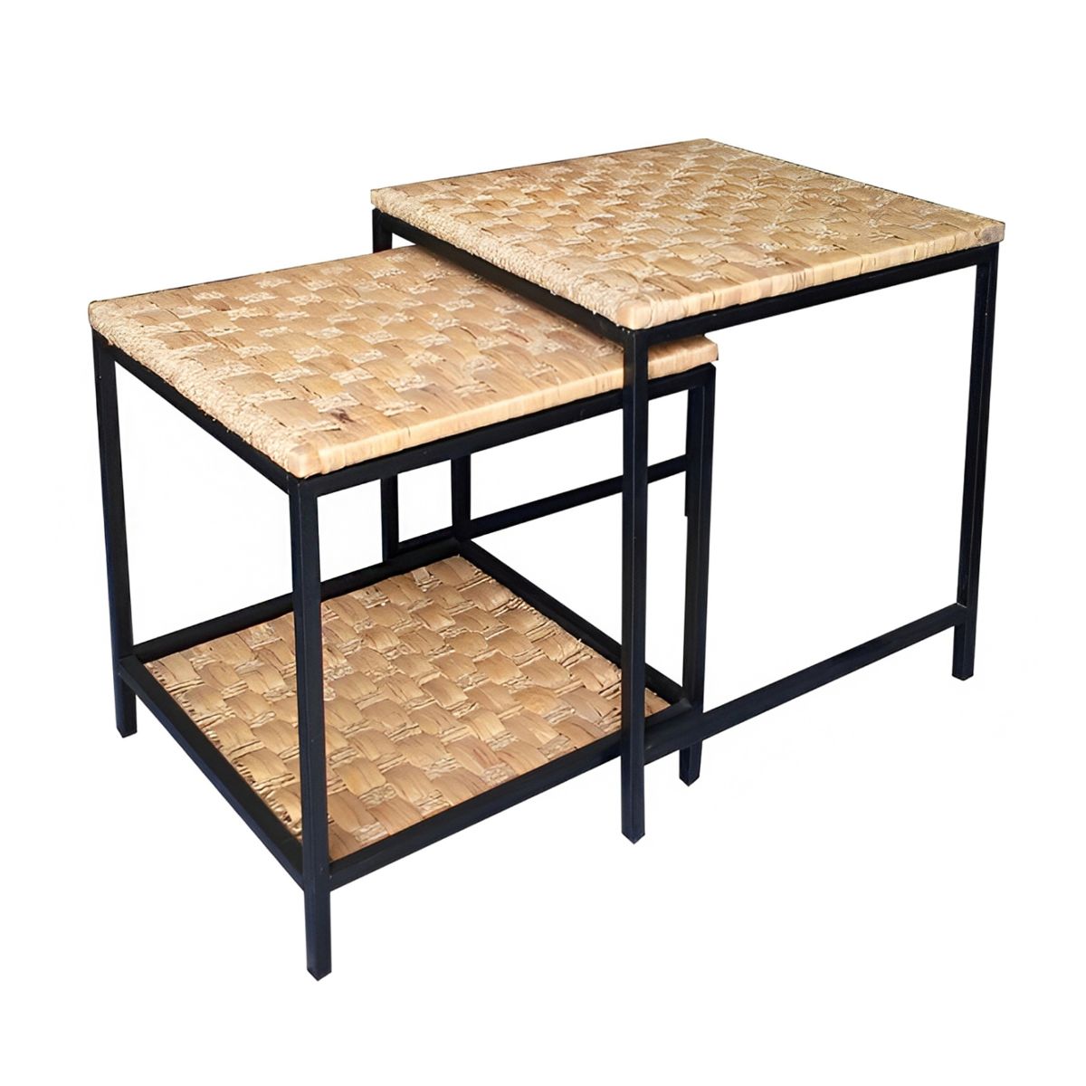 This Nature Craft set of two nesting tables features sturdy black metal frames. Each table boasts a beautifully hand-woven natural fiber top and a matching lower shelf, providing both style and practical surface space. These versatile pieces can be tucked away or expanded to suit your living needs.