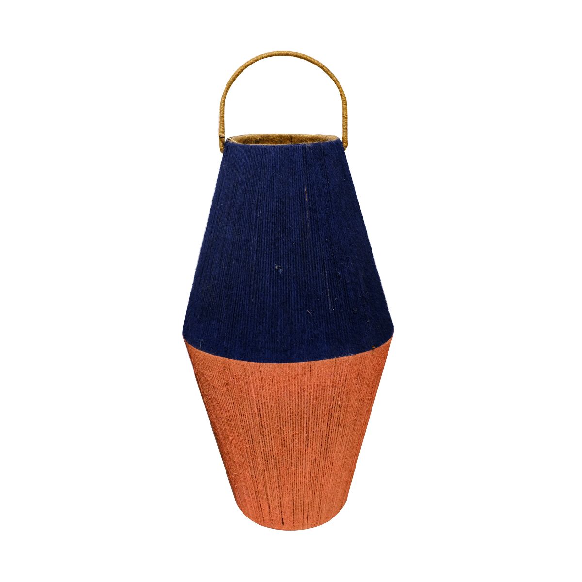 Introduce a bold, artistic flair with the Nature Craft Two-Tone Fiber Lantern. Featuring a striking contrast, the deep navy upper section meets a warm terracotta lower part, both crafted with a textured natural fiber weave. The sturdy natural cord handle allows for easy placement, making it an eye-catching and mood-enhancing addition to your living space.
