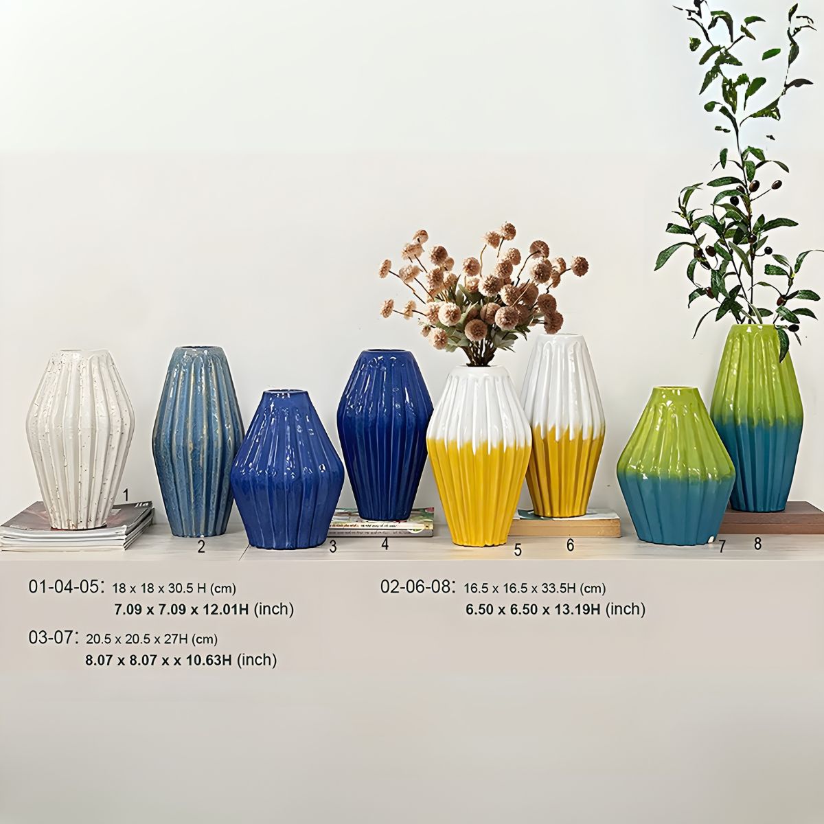 This Nature Craft collection offers a diverse range of ceramic vases, each with distinctive ribbed textures. Available in various sizes and vibrant colors including white, blue, yellow, and green, some featuring eye-catching two-tone designs. These versatile pieces from Nature Craft add modern elegance and a pop of color to any interior.