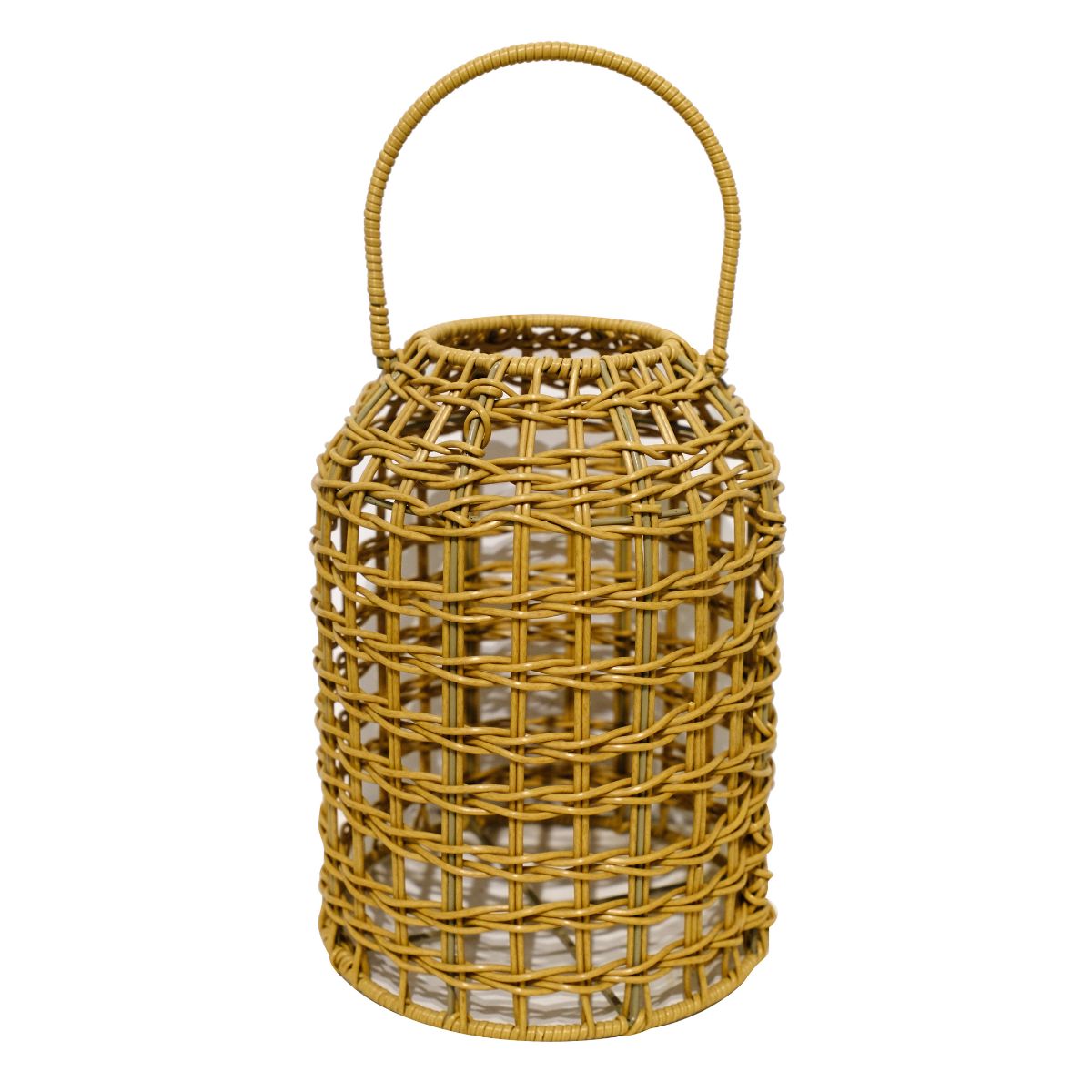 This elegant Nature Craft lantern features a natural-toned, open-weave rattan body, allowing light to beautifully filter through. Its classic barrel shape with a subtly tapered neck is topped with a sturdy, integrated handle for easy carrying. This piece provides a charming and airy accent, perfect for adding a touch of rustic sophistication to any space.