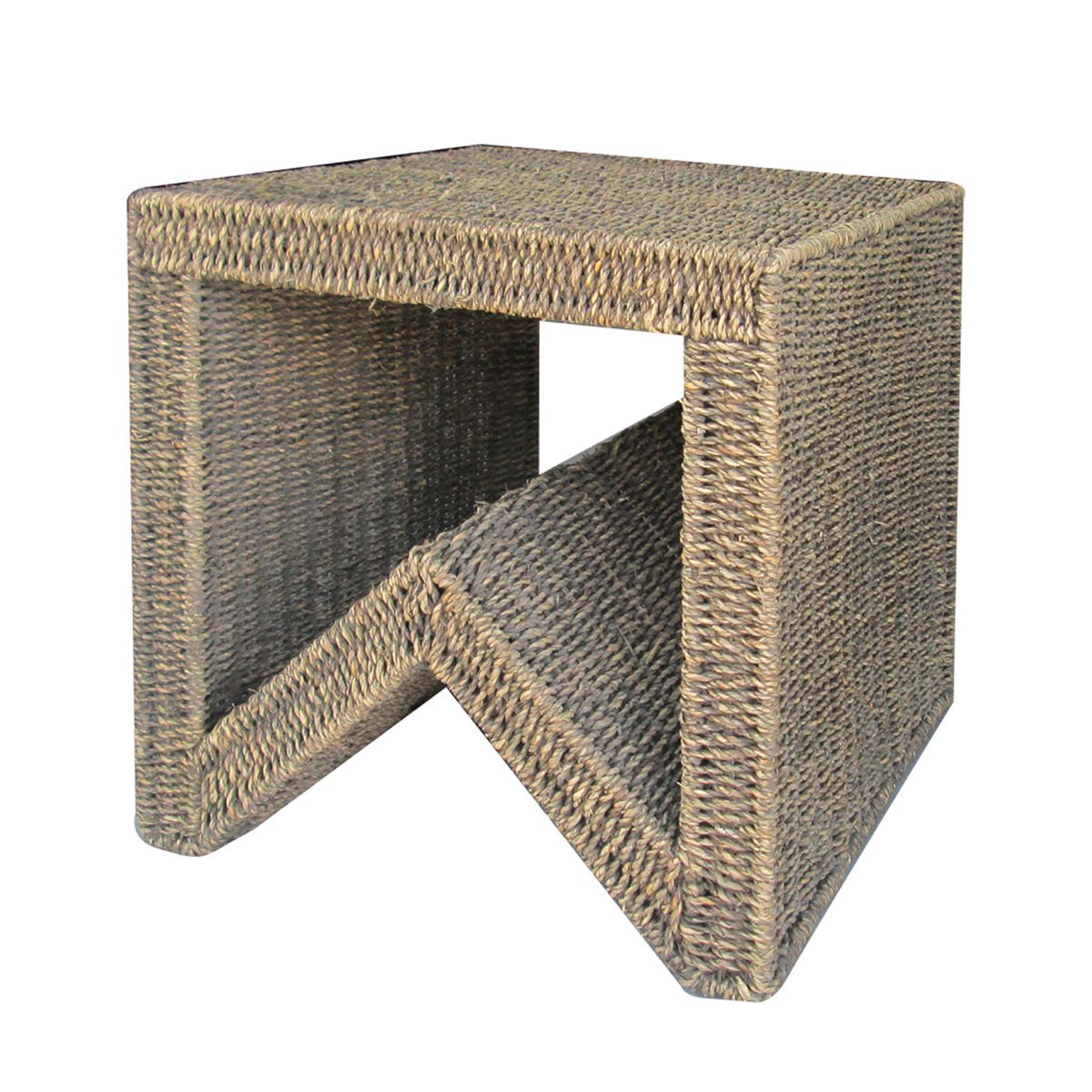 This Nature Craft accent table features a unique U-shaped design, meticulously hand-woven from natural fibers in a rich, dark hue. Its solid construction and integrated angled shelf provide both a distinctive aesthetic and practical storage or display space.