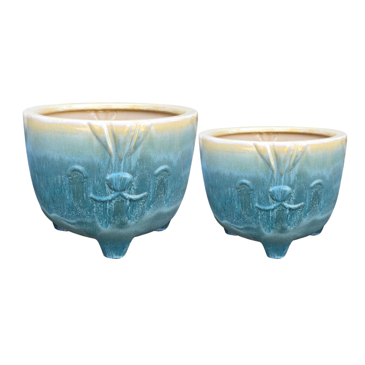 Bring playful charm to your home with the Nature Craft Feline Friends Planter Set. These two adorable ceramic pots, in complementary sizes, feature a delightful ombre glaze transitioning from sunny yellow to serene teal. Each planter showcases charming embossed cat facial features and small feet, adding a whimsical touch. Perfect for succulents or small plants, this unique set celebrates your love for nature and pets.