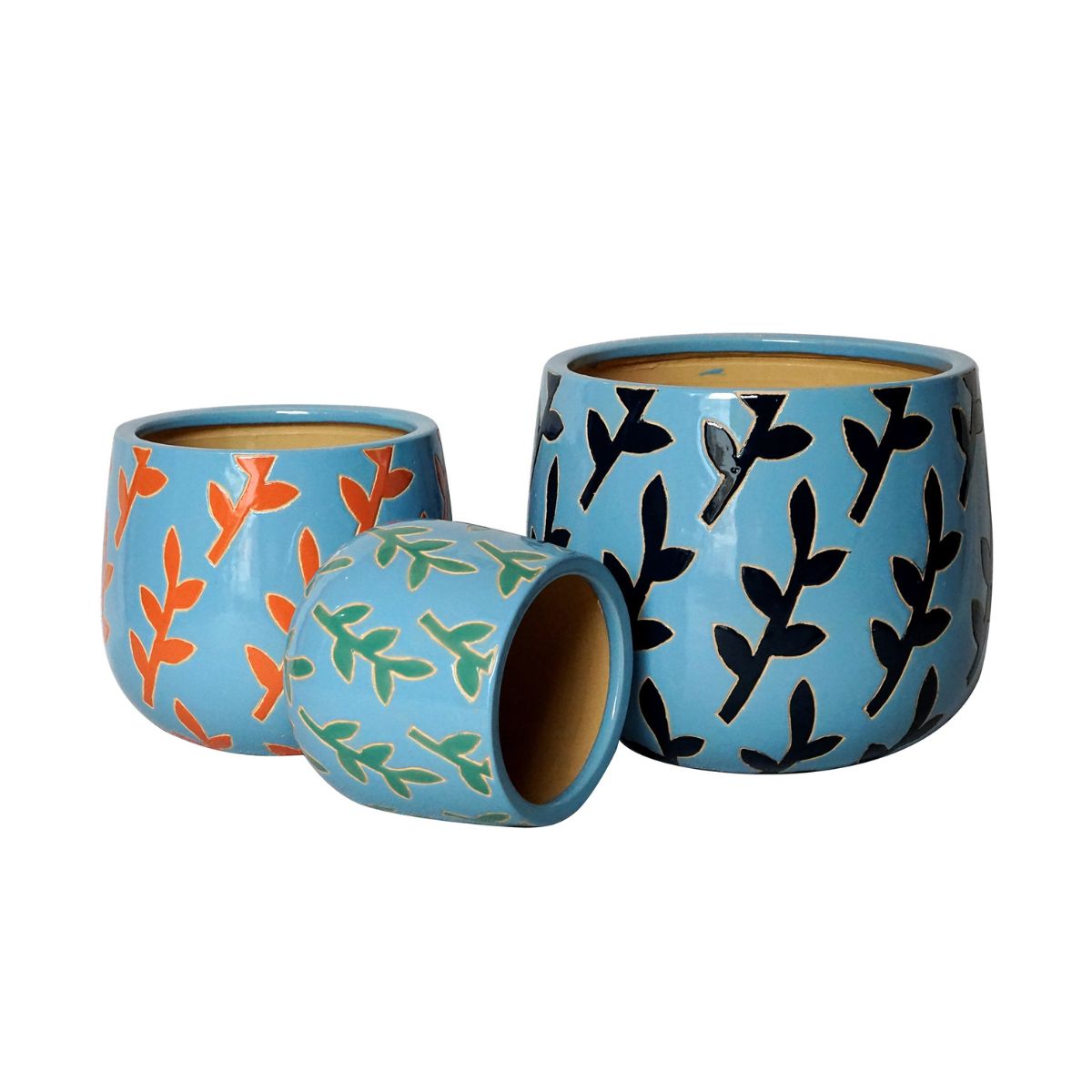 Bring vibrant garden charm indoors with the Nature Craft Botanical Planter Set. This trio of ceramic pots, in varying sizes, features a captivating blue base adorned with bold leaf patterns in contrasting orange, green, and black. Perfect for succulents, herbs, or small plants, they add a lively and artistic touch to any space. Durable and eye-catching, this set beautifully combines functionality with contemporary design.