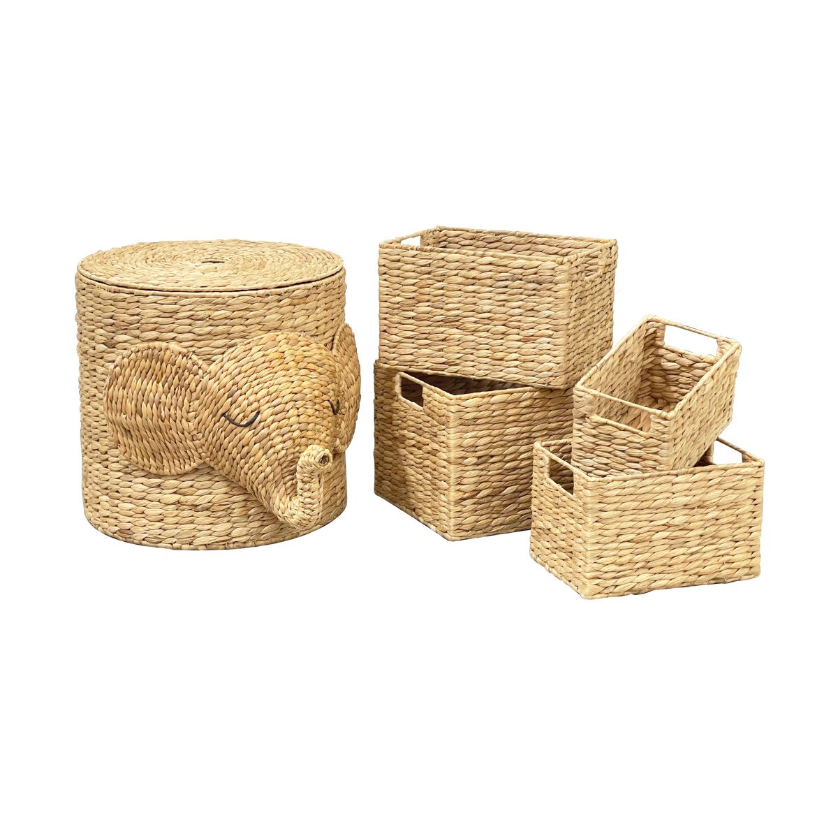 This Nature Craft set includes a charming elephant-shaped hamper with a lid and four versatile rectangular baskets, all hand-woven from natural fibers. The elephant offers playful covered storage, while the open baskets provide adaptable organization. This collection combines whimsical design with practical utility, perfect for a tidy, nature-inspired home.