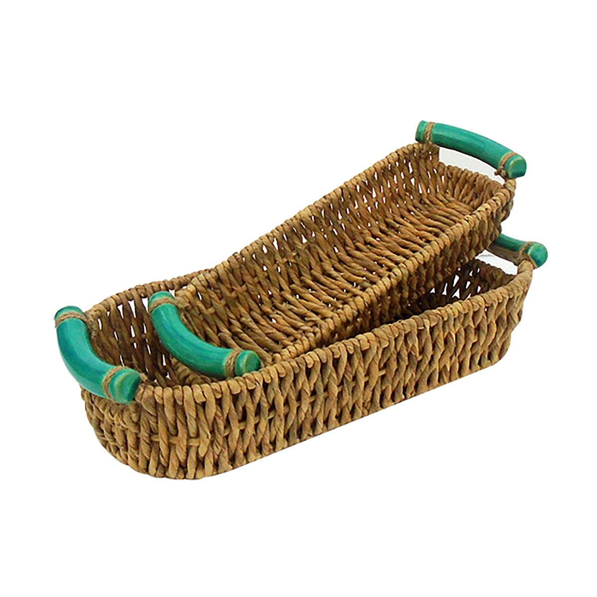 Organize your table in style with the Nature Craft Water Hyacinth Bread Basket. This set of two elongated trays, handwoven from natural water hyacinth, features vibrant green wooden handles for a pop of color and easy carrying.