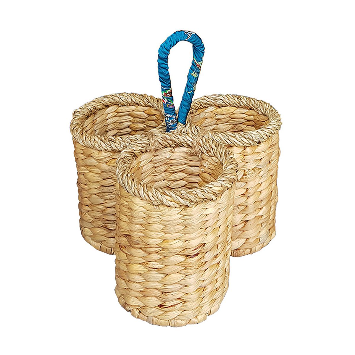Efficiently organize with coastal charm using the Nature Craft Water Hyacinth Triple Caddy. This unique caddy features three cylindrical compartments, meticulously handwoven from natural water hyacinth for a rich, organic texture. A vibrant, multicolored fabric-wrapped handle adds a playful touch and allows for easy transport, making it a stylish and functional addition to any space.