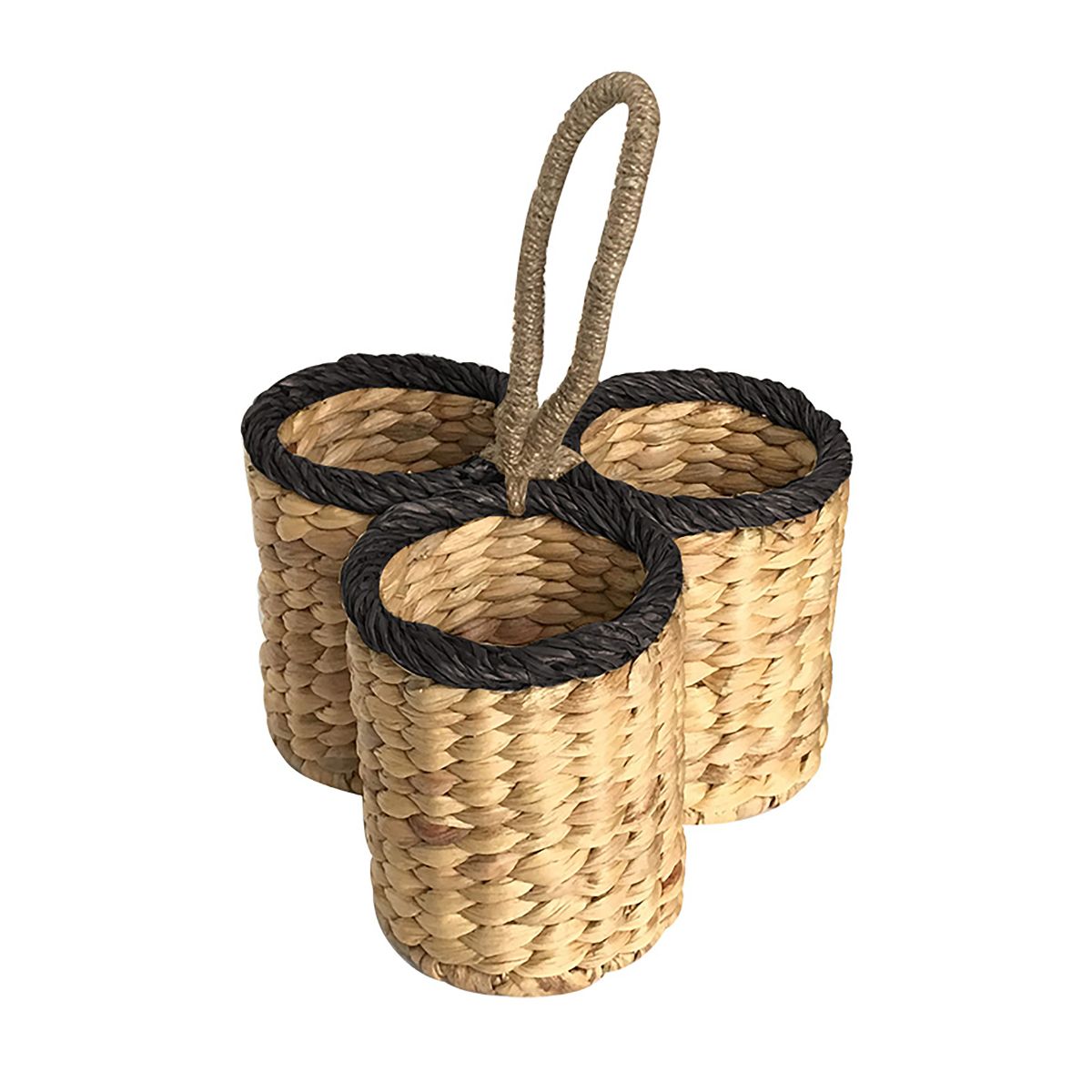Add charming and versatile organization with the Nature Craft Water Hyacinth Triple Caddy. This unique piece features three cylindrical compartments, meticulously handwoven from natural water hyacinth, offering a rich, organic texture. Each compartment is accented with a contrasting dark trim around the rim, and a sturdy braided handle provides easy portability, making it a stylish and functional addition to any space.