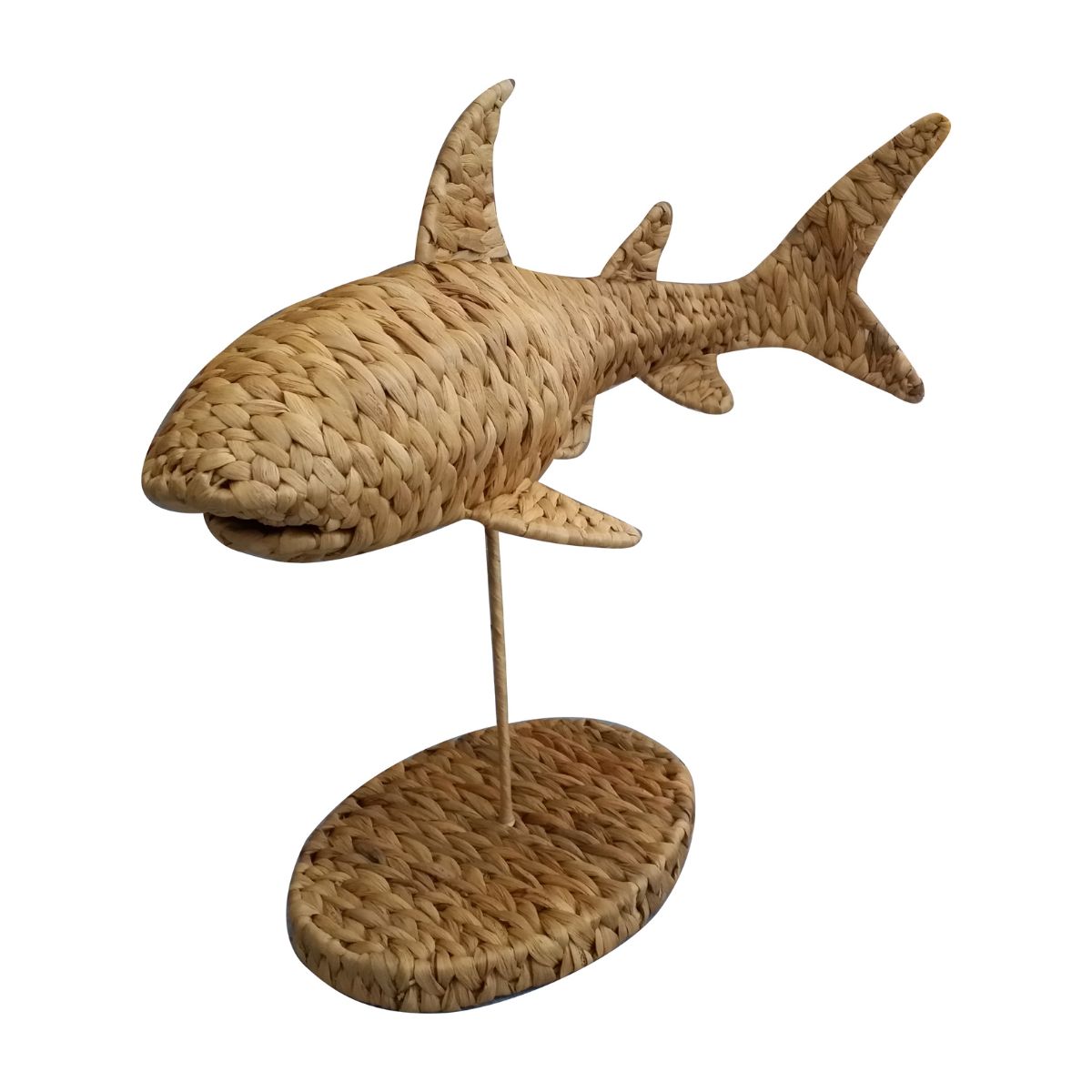 This Nature Craft shark sculpture is expertly crafted from woven natural fibers, creating a textured and organic look. Perched dynamically on a slender stand rooted in an oval base, this piece captures the sleek form of a shark. It's a perfect nautical accent, bringing a unique blend of coastal charm and natural artistry to any room.
